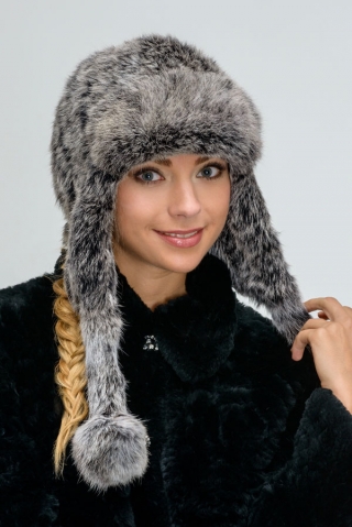 Описание: Классическая форма шапки - ушанки с отворотом, на концах удлиненных ушек помпоны.