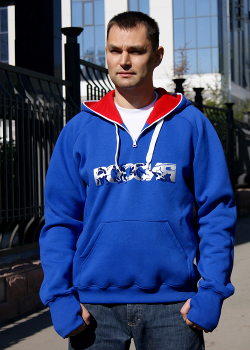 Спортивный фасон толстовки дополняет уникальный дизайнерский рисунок. На груди толстовки надпись "Россия" сделана серебряными буквами. На ее фоне рисунок с изображением двух борцов, проводящих прием, символизирует волю к победе, стремительность и силу.