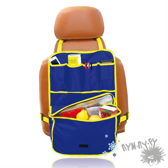 Автомобильный органайзер термосумка состоит из 4-х удобных карманов, и отделения-термоса, закрывающегося на молнию, в котором можно запасти на дорожку продукты и напитки, как холодные, так и горячие.