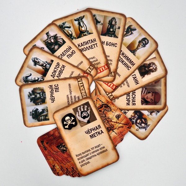 Шайка пиратов в лице Слепого Пью, Джона Сильвера, Билли Бонса и Серного Пса берут на себя функцию мафии. А борятся с ними достойные джентльмены, Капитан Смолетт, Доктор Ливси, славный малый Джимми Гоккинс (точнее даже славные малые Дж. Гоккинсы). Помимо них в колоде есть роковая и прекрасная Мэри, и одичавший на необитаемом острове маньяк Бен Ганн. Карта Черная метка ведет игру, вершит судьбы.