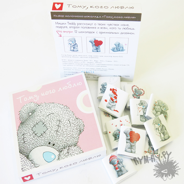 Милый и трогательный мишка Тедди поможет Вам высказать свои чувства самым родным и любимым людям. Шоколадный набор <<Тому, кого люблю>> - 12 плиточек молочного шоколада отменного качества, в оригинальных обертках, которые все скажут вместо Вас. Оригинально оформленные яркие обертки и очень вкусный шоколад понравятся абсолютно всем!