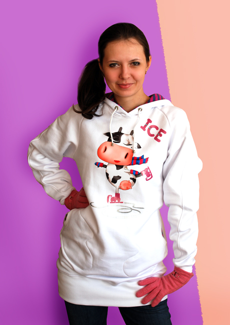 Принт: аппликация размещена на передней полочке. Выполнена из сублимационной плёнки, серебряной и розовой мерцающей плёнки.