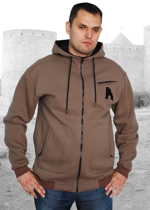 Плотность 330г/м2. Состав: 80% хлопок, 20% полиэстер. Цвет коричневый, отделка черная