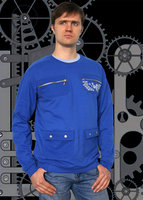 Толстовка с округлым вырезом горловины, отделанным эластичной резинкой, с манжетами на рукавах и по низу изделия. Спереди имеются два кармана на молнии и два кармана на кнопках (кнопки в виде стильных металлических болтов).