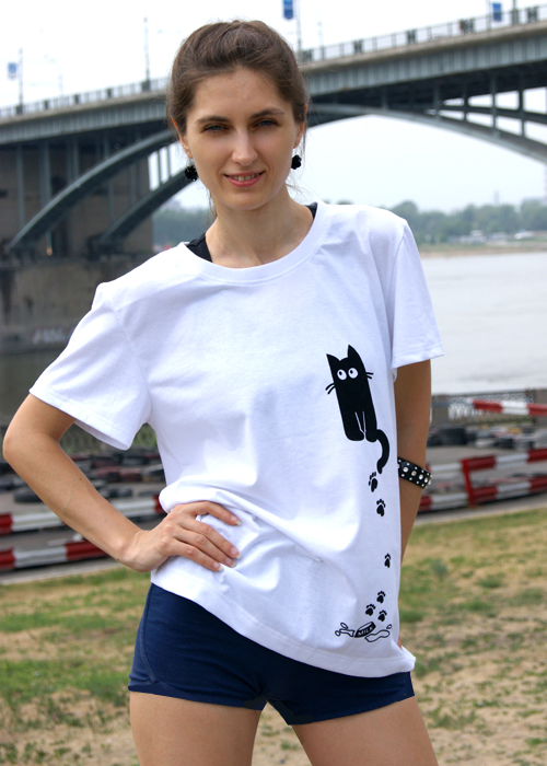Белая футболка свободного стиля из лёгкого тонкого хлопкового трикотажа. Модель имеет классический футболочный крой, что отлично подойдёт как к шортам или джинсам, так и к юбке или бриджам. Захватите её в отпуск или на отдых, она не займёт много места в чемодане, и станет спасительницей для долгих экскурсий или просто прогулок под жарким солнцем. Она укроет плечи и тело от солнца, а ткань будет хорошо пропускать воздух, позволяя коже дышать. Эта универсальная вещь сочетается с любыми цветами одежды. Белый цвет футболки придаст нарядности вашему образу, а игривый рисунок с котёнком добавит настроения! В этой футболке Вы будете неординарной модницей! Длина по спинке около 64 см.
