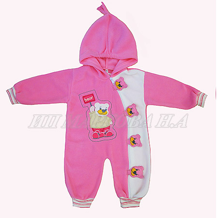 Комбинезон детский с капюшоном, декорирован аппликацией. Застежка- молния на всю длину. Трикотажные манжеты на рукавах и штанинах.