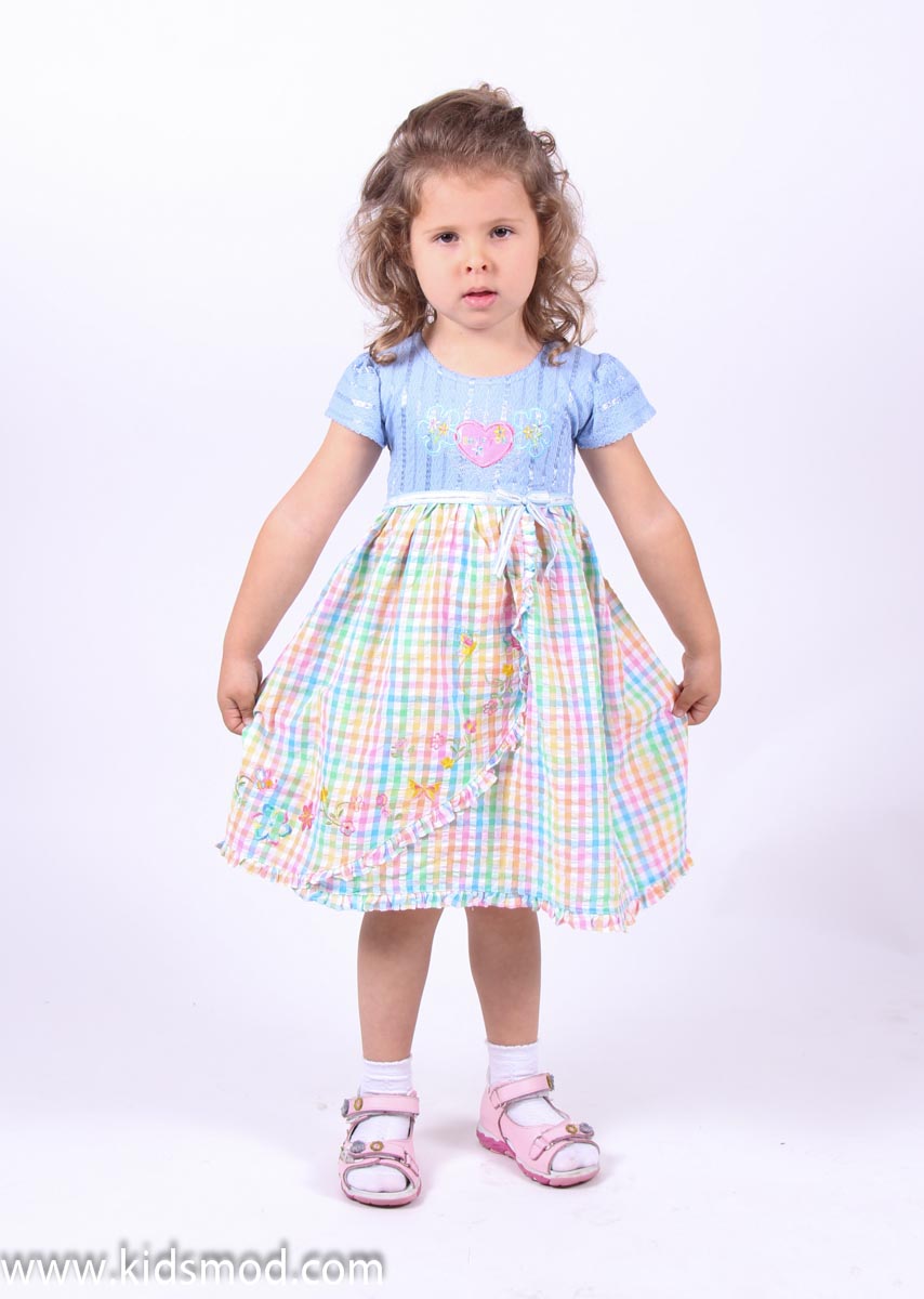 Платье для девочки, декорированное вышитым рисунком на груди и на юбке, имеется тоненький поясок. Трикотаж.