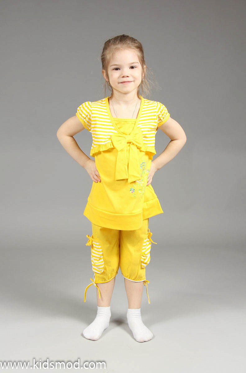 Комплект для девочки: футболка и бриджи, футболку украшает бантик и вышитая надпись, на бриджах два кармашка, каждый из которых украшает бантик.