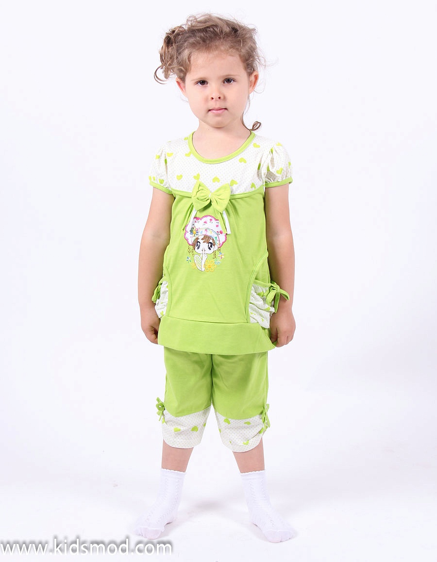 Комплект для девочки: кофта + бриджи, кофточка декорирована рисунком и бантиком по центру, есть два кармашка по бокам, бриджи украшены небольшими бантиками.