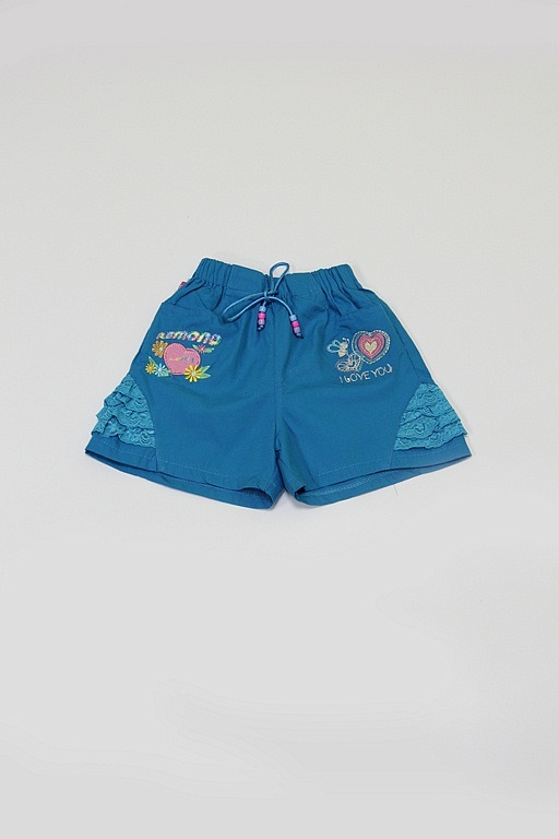 Модные шортики для девочки, декорированы рисунком и кружевами по бокам.