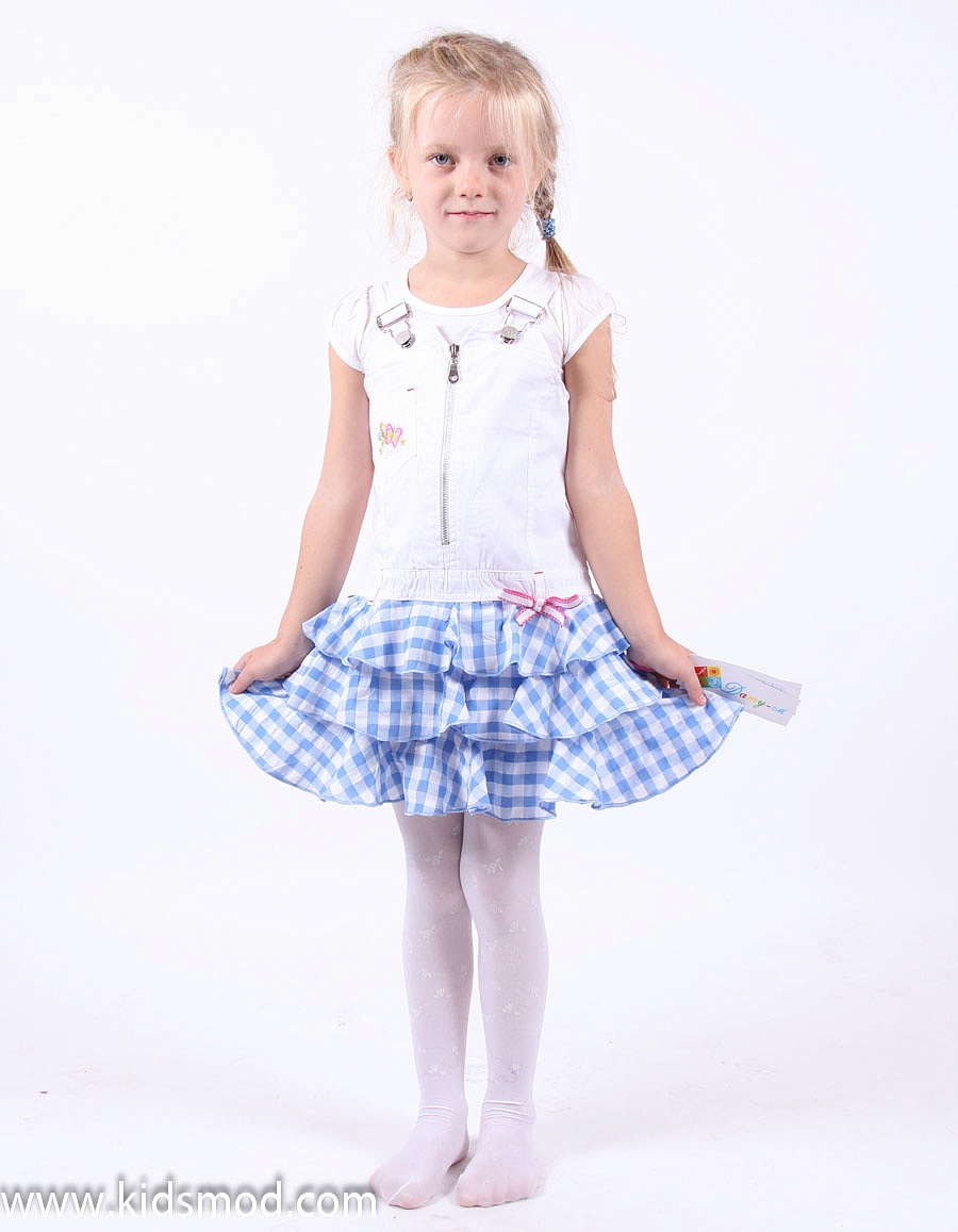 Модный сарафанчик для девочки на молнии, оформлен воланами, аппликацией на кармашке и небольшим бантиком.