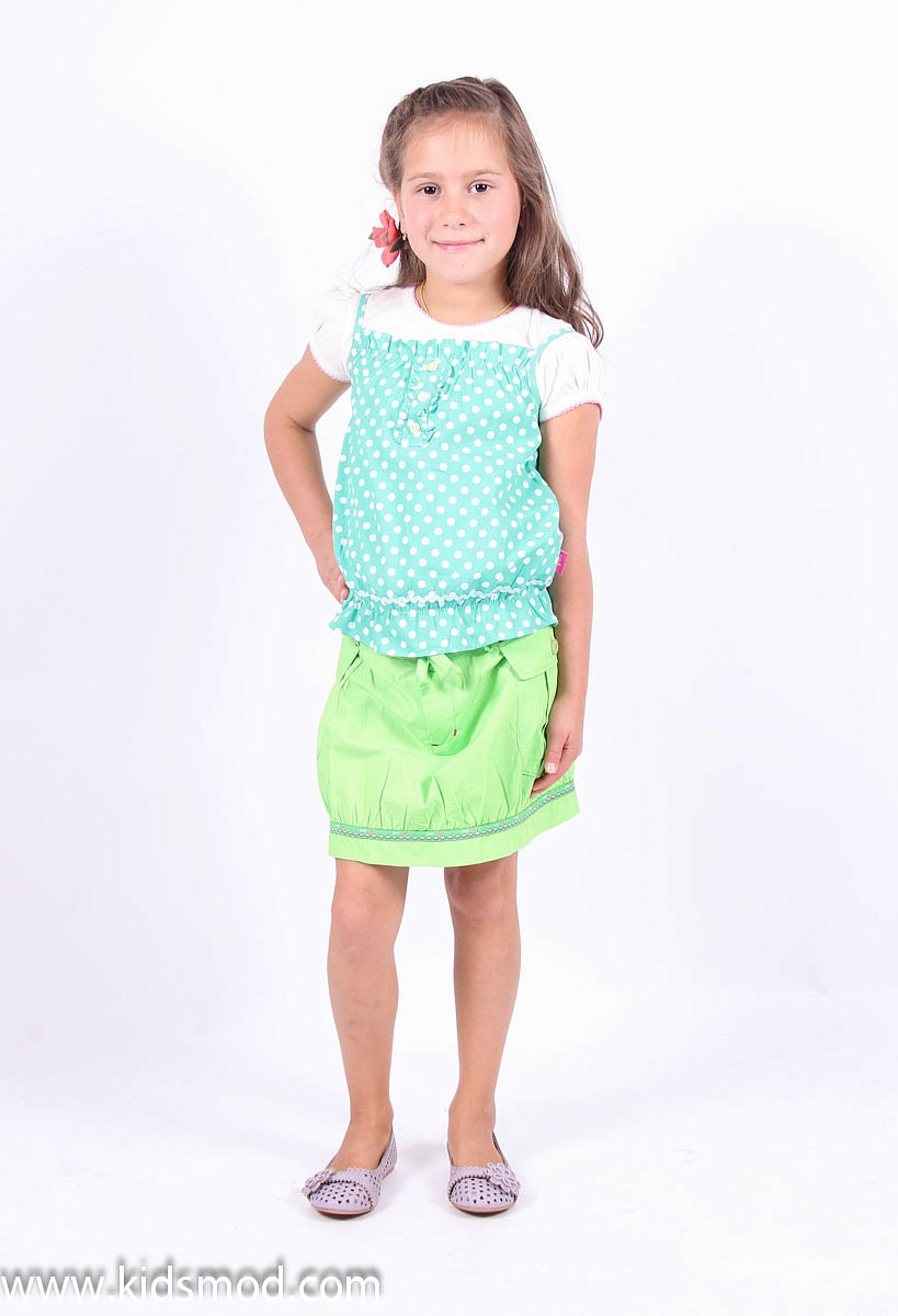 Комплект для девочки, в который входит футболка, украшенная рисунком по центру и яркая майка.