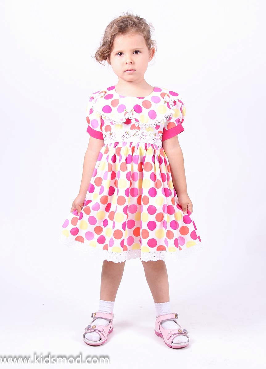 Нарядное платье для девочки в ярких цветах, декорировано кружевным поясом, с маленькими нежно- розовыми розочками, ворот также украшен кружевами с розами.