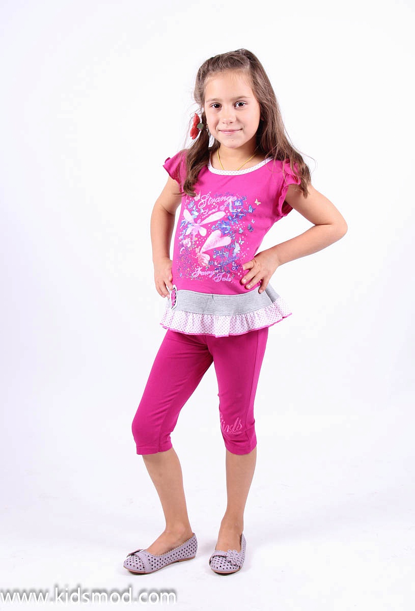 Футболка для девочки, декорирована рисунком по центру и волнообразными краями снизу и по краям рукава.