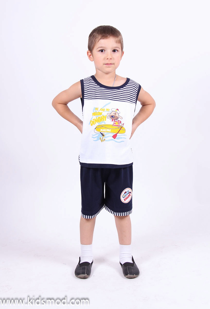Комплект для мальчика: майка и шорты, майка украшена рисунком по центру, на шортиках одна эмблема. Трикотаж.